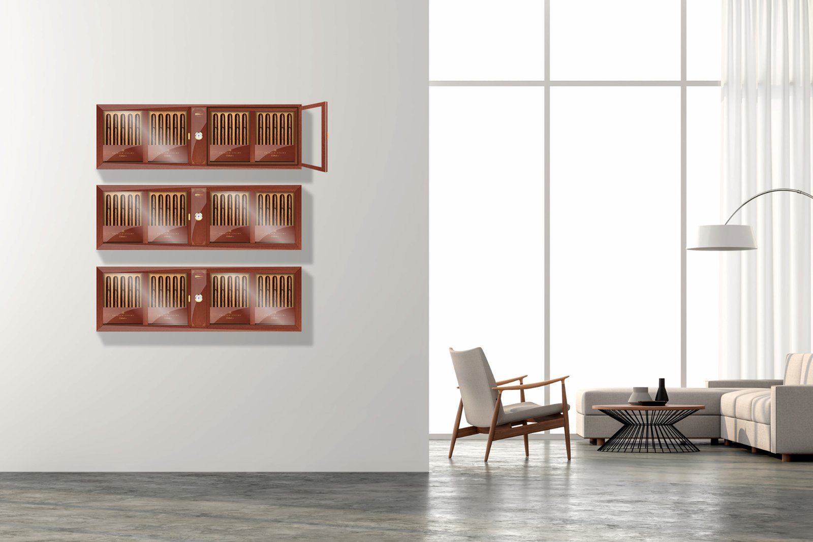 The double vertical humidor is an original design of Sophisticated Design, are special boxes of Spanish cedar, to place on the wall, with door and perfect sealing. Available for 10 or 20 cigars, it allows the aficionado to always have his favorite cigars in sight, with humidification and anemometer. Many aficionados can place these sets in double sets or in sets of several sets. Also as an element of decoration in your home, Cigar Lounge or stores, being able to have several placed in line or one below the other, depending on the space you have available. They can be personalized with any name or brand, as well as color options desired by the customer.