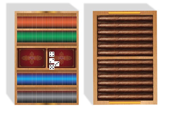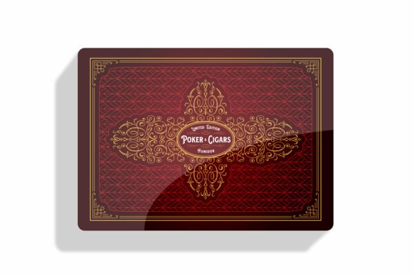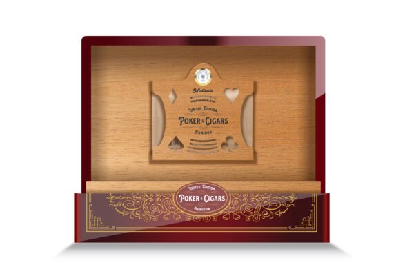 The Poker Humidor, (34 cm x 11 x 24 cm) is a real scale of a deck of cards of the well-known game, it includes two trays, one of 40 cigars and the tray that includes 2 deks of poker cards with their original chips. An excellent high quality item with Spanish cedar interior. It includes in the price your personalization with name or brand of your choice.